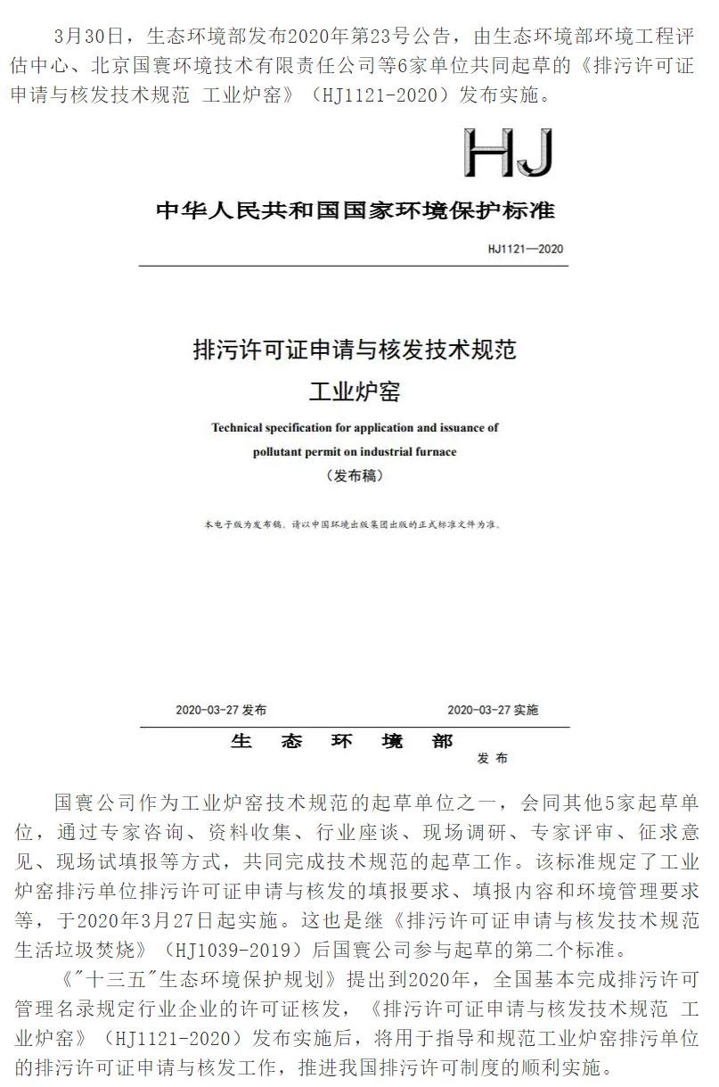 國寰公司參與起草的《排污許可證申請與核發技術規范 工業爐窯》(HJ1121-2020)發布實施