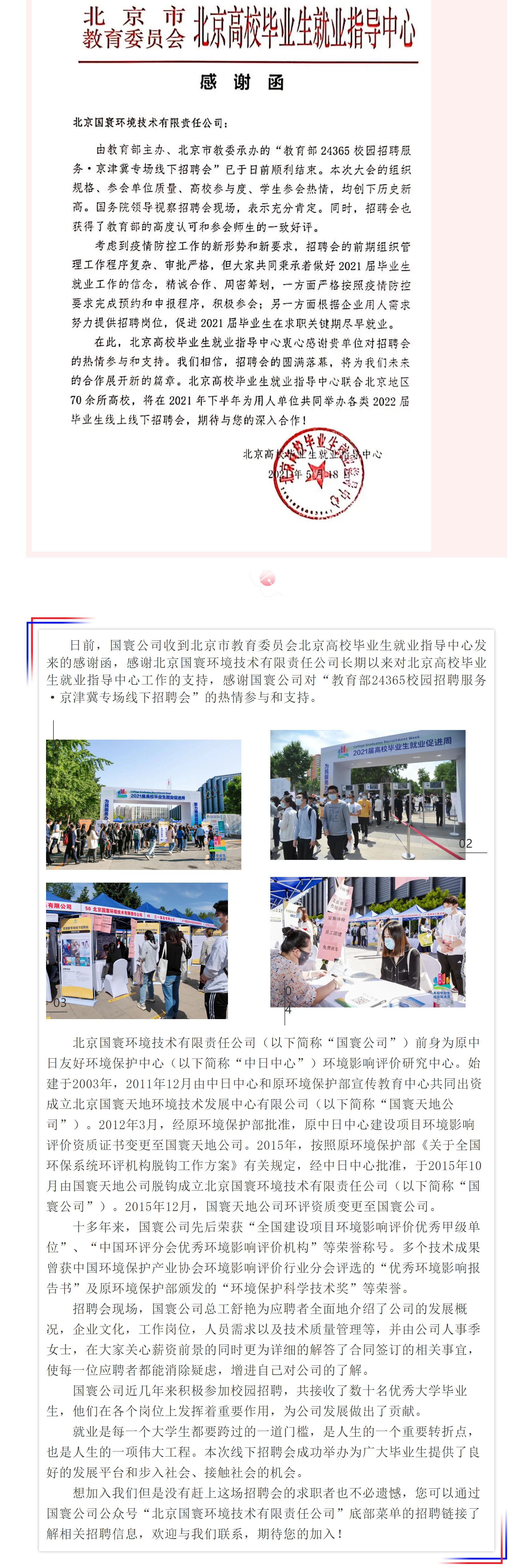 國寰公司收到北京市教育委員會北京高校畢業生就業指導中心感謝函
