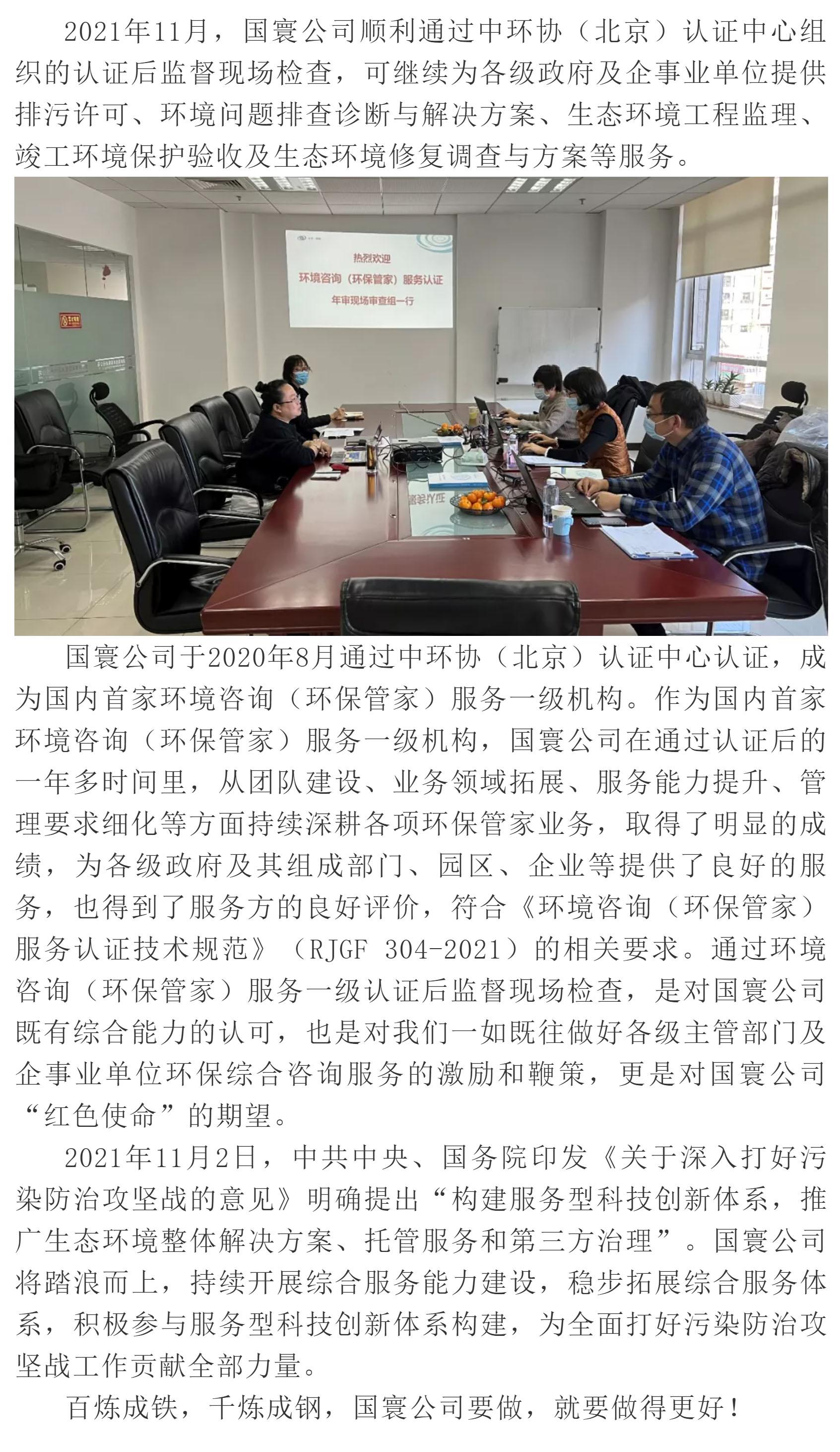 建立長效監(jiān)督機制,穩(wěn)步提升服務(wù)質(zhì)量,國寰公司順利通過環(huán)境咨詢(環(huán)保管家)服務(wù)一級機構(gòu)認證后監(jiān)督現(xiàn)場檢查